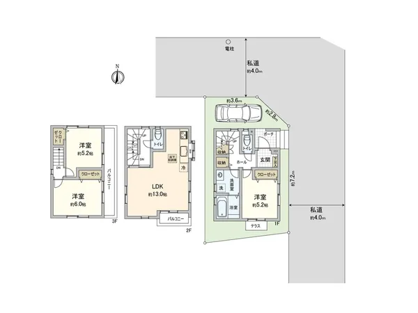 東側:幅員 約4.0m (私道) 、 北側:幅員 約4.0m (私道)