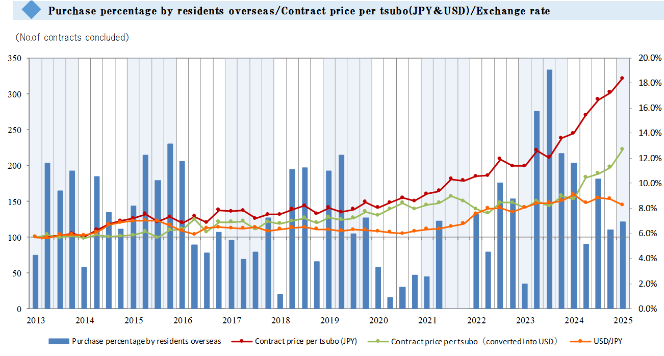 The chart above shows the percentage of purchases by overseas residents among Mitsui Fudosan Realty Group transactions and their average contract prices per tsubo (JPY and USD) compared to the exchange rates.