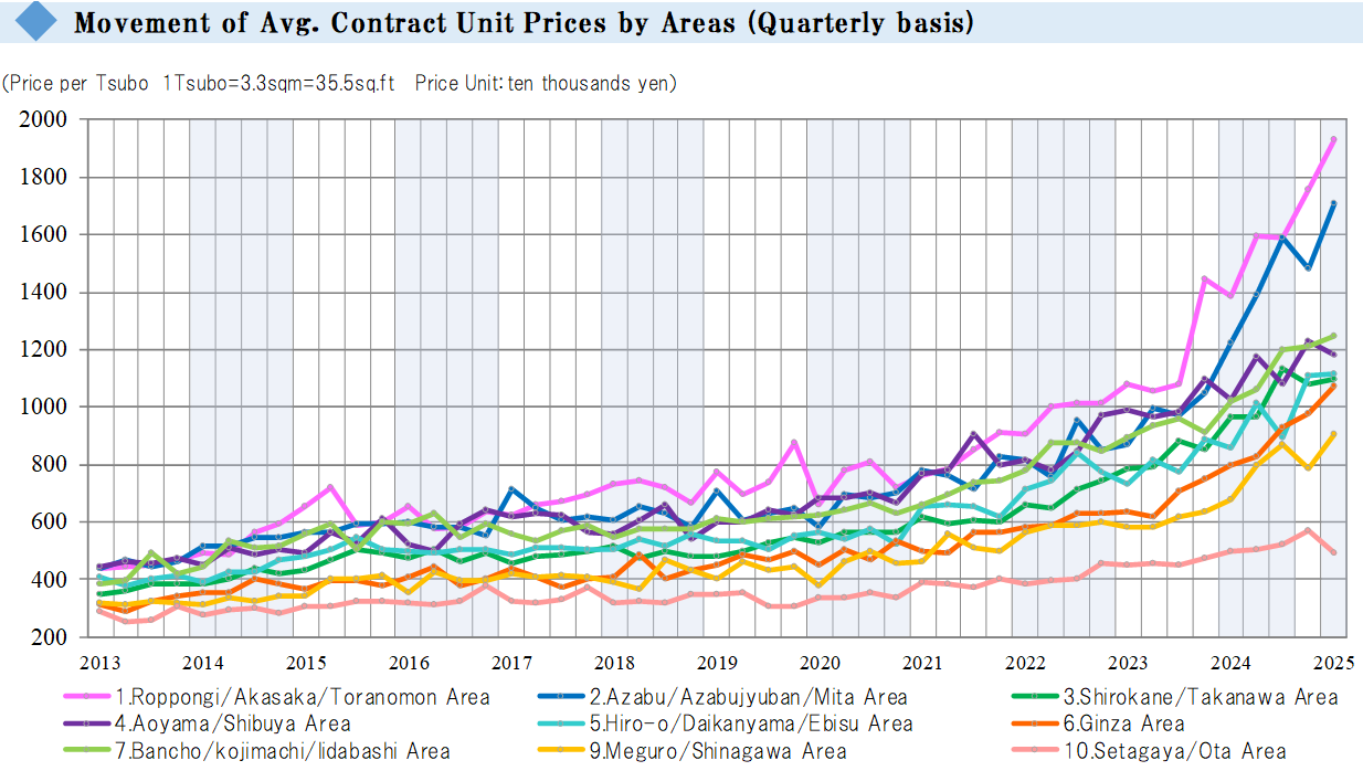 The chart above shows the trend in the average contract price per tsubo by area. While the average contract price decreased this quarter in the three areas of the "Aoyama / Shibuya Area," the "Meguro / Shinagawa Area," and the "Setagaya / Ota Area," it increased in seven other areas. In six of these seven areas, it reached a new record high since the beginning of data collection. Among these, the average contract price reached a new record high for the seventh consecutive quarter in the "Ginza Area," the fifth consecutive quarter in the "Bancho / Kojimachi / Iidabashi Area," and the second consecutive quarter in the "Roppongi / Akasaka / Toranomon Area" and the "Hiroo / Daikanyama / Ebisu Area."