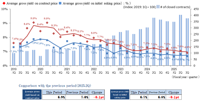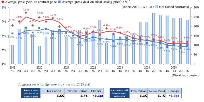 The indices of the average gross yield on the initial asking price and on the contract price were down by 0.2 points and 0.3 points quarter over quarter (QoQ) (prices rose), respectively, in the Tokyo Central submarket in 3Q of FY 2025, while the number of contracts made increased YoY. However, since this includes multiple properties contracted at low yields, conceivably for purposes of vacating and redevelopment instead of yields, the decreasing trend in yields warrants further monitoring.