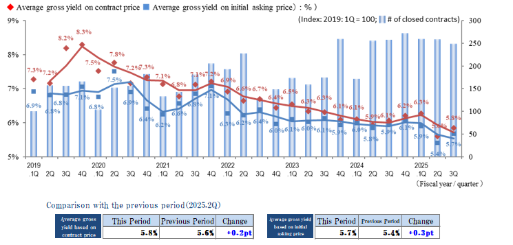 The yield index trends in the investment real estate market in the Tokyo East submarket showed a clear turning point in 3Q of FY 2025. The indices of the average gross yield on the contract price and on the initial asking price were 5.8% (up 0.2 points QoQ) and 5.7% (up 0.3 points QoQ), respectively, as yields increased (prices were adjusted). While rising prices drove yields down, centered on newer properties, in 2Q, this quarter's results seem to be affected by such factors as a stronger yield orientation among investors and an increase in transactions that involve price adjustments.