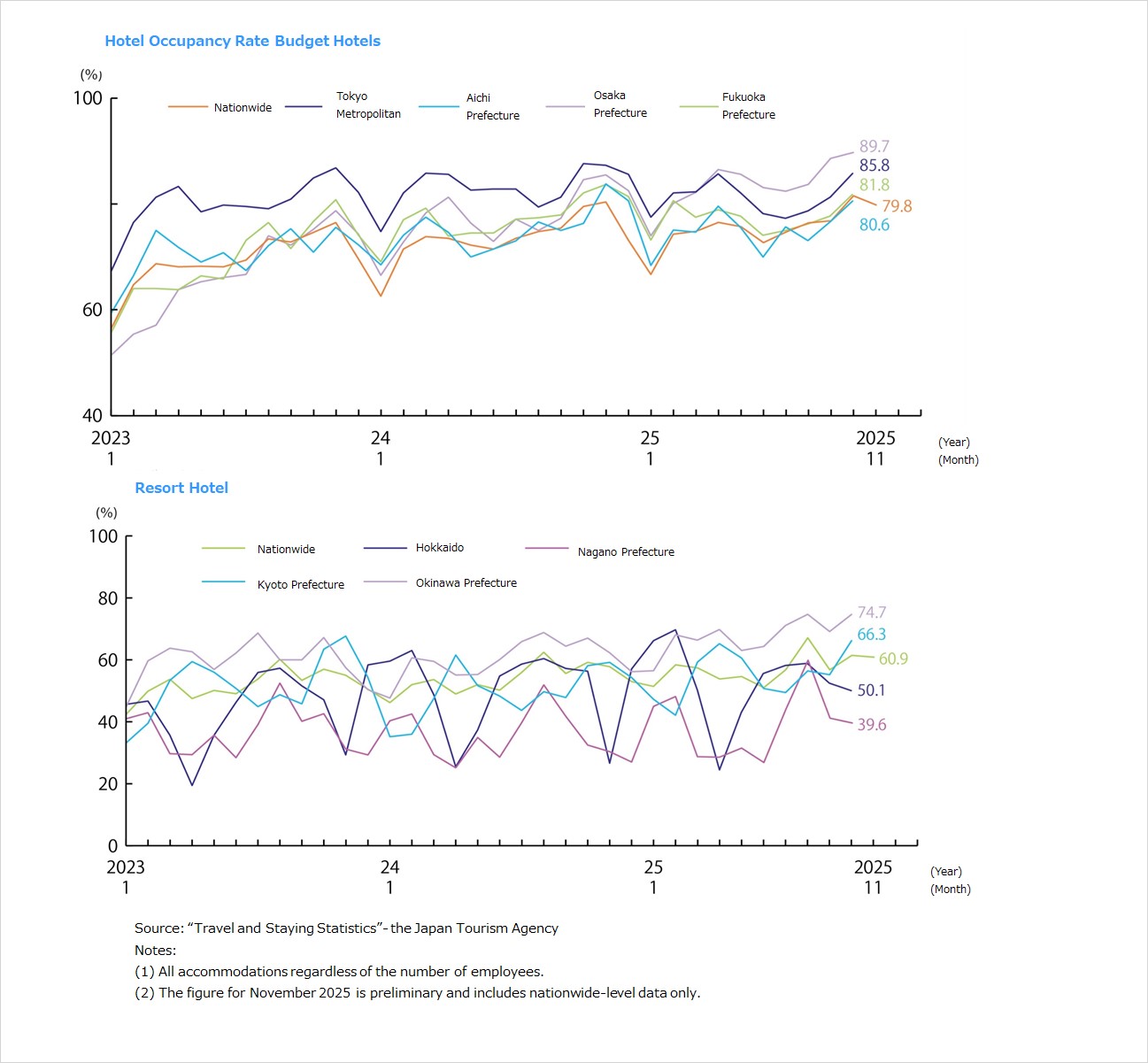 ・Guestroom utilization rates (at facilities with 10 or more employees) in December 2025 were 35.3% for Japanese-style inns, 53.7% for resort hotels, 73.6% for limited-service hotels, and 73.0% for full-service urban hotels. Rates were highest for limited-service hotels and full-service urban hotels. The guestroom utilization rate for limited-service hotels exceeded 80% in three districts: Saitama, Tokyo, and Kanagawa Prefectures, while the rate was 77.2% in Kyoto Prefecture.